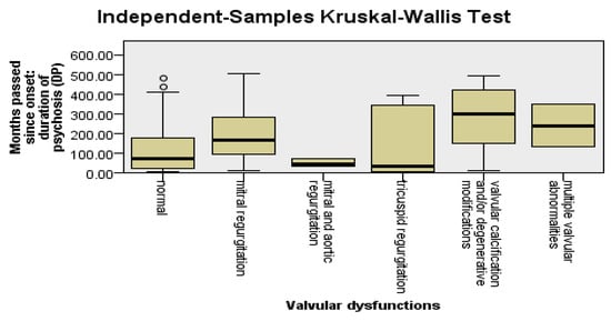 To detect the types of valvular changes that were more frequent among patients with DP and a longer pre-LAI antipsychotic duration, we applied the Kruskal–Wallis test, followed by the Dunn–Bonferroni post hoc test. Mitral regurgitation was found to be significantly more frequent among patients with DP (p = 0.03) and the pre-LAI antipsychotic duration (p = 0.03) was longer. The other types of valvular changes did not have statistically significant relevance in relation to DP, the pre-LAI antipsychotic duration, or the LAI antipsychotic duration; see Figure 4.
