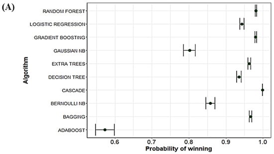 Bayesian ACC and density ACC using instances. Probability of wining for each classical machine learning technique separately and the cascade model. Panel (A): Results represented as Bayesian average coverage criterion. Panel (B): Results represented as density average coverage criterion.
