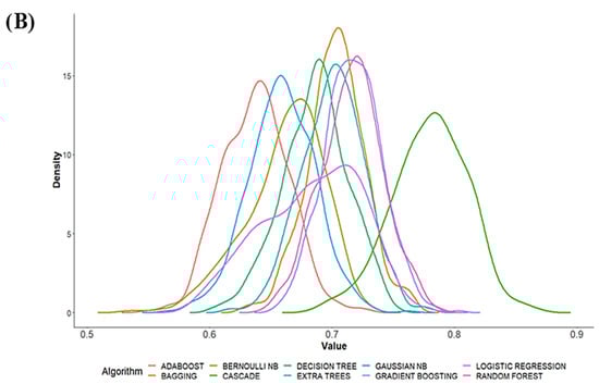 Table 4 shows the rankings for each algorithm/instance. The results reveal that the cascade classifier achieved the top-ranking position in all instances, followed by the gradient boosting and random forest models. The cascade classifier achieved a statistically significantly better ranking compared to the rest of the predictive models tested. In addition, Figure 2A represents the probability of being the best method, denoted as the probability of winning, and its standard deviation for the results obtained with accuracy as the objective function. The cascade model had the highest probability of winning, with the lowest deviation compared to the rest of the models and without competing models in the same space. It was also supported by the ranking of models and represented by a density plot as a function of the accuracy obtained by the models in all their versions (Figure 2B). As shown, the cascade model concentrates most of the results around 79% accuracy, while the rest of the models presented 70% or lower (Figure 2B). All the results show that the cascade classifier is the best classifier model for predicting overweight/obesity among all the models tested.
