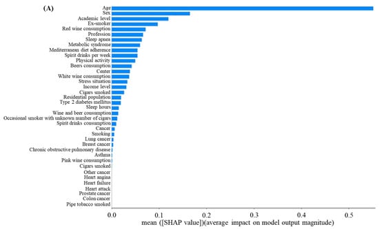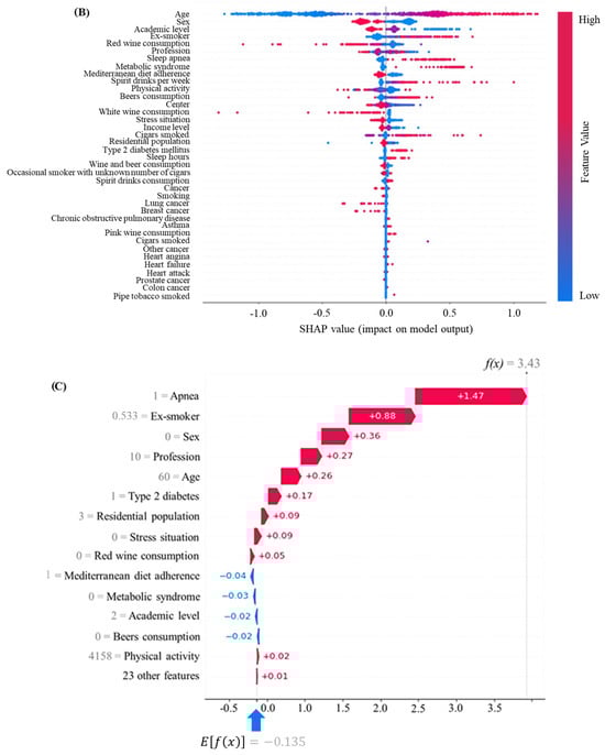 Figure 3A shows the feature importance plot based on the cascade flow model. The model´s SHAP interpretation revealed that age was the variable with the greatest impact on predicting overweight/obesity (Figure 3A). Other variables, such as sex, education level, profession, and aspects related to smoking and alcohol consumption; several disorders, including apnea and metabolism syndrome; Mediterranean diet adherence; and physical activity, were important predictive factors for gaining weight, with the MDI ranging from 0.05 to 0.18.