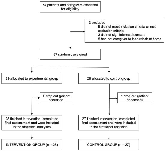 The patients’ sample size “n” was calculated to represent the total population of patients who suffered a stroke and were admitted to a second-level hospital in Málaga, Spain, and who presented some post-stroke sequelae that made it difficult to carry out ADL. It was based on EOTIPS primary outcome SAQOL-39 [] with the sample size determination formula for two independent groups, assuming a mean of 2.50, standard deviation of 0.75, significance level of 5%, a power of 80%, and a critical difference of 0.54, obtaining a sample of 30 participants per group and a total of 60 participants. Therefore, two groups were formed: an intervention group of 30 patients who received EOTIPS, of whom 29 had a caregiver who participated in the research, and a control group of 30 patients who received conventional rehabilitation and care, of whom 28 had a caregiver. Therefore, a total n of 57 patients with their caregivers were evaluated and analysed to answer the current research question.