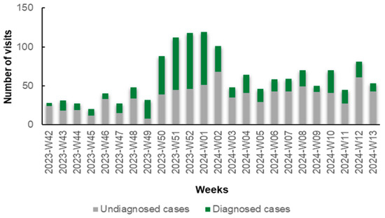 Number of diagnosed (green columns) and undiagnosed (gray columns) cases of respiratory viruses via rapid antigen tests in patients with symptoms of respiratory infection presenting to the Emergency Department (ED) and Respiratory Medicine Department of the University Hospital of Larissa, Greece, between 16 October 2023 (W42), and 31 March 2024 (W13), by epidemiologic week.