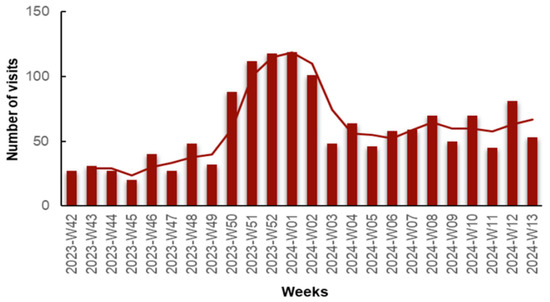 We observed an increase in visits in early December, peaking at weeks 52, 2023 and 01, 2024 (late December, early January). This significant rise can be attributed to the increase in influenza A-positive and COVID-19-positive cases, as we will elaborate on later. A second spike in visits was observed during weeks 08 to 13, 2024, possibly attributed to the Flu-B wave, as we will discuss further (Figure 2).