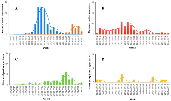 Notably, during the initial weeks (W42–W48, 2023) and the concluding weeks (W02–W13, 2024) of the study, the number of patients diagnosed with specific antigens through rapid tests was lower compared to those who remained undiagnosed. Conversely, in the intervening period (W49, 2023 to W01, 2024), this trend reversed, with a predominance of diagnosed cases over undiagnosed ones (Figure 1). This reversal is primarily attributed to the prevalence of influenza A during this period. In detail, during W42–W48 and W02–W13, 291 patients received a diagnosis (30.16%) and 674 remained undiagnosed (69.84%) via rapid antigen testing. From W49 to W01, 279 (59.49%) received a diagnosis and 190 (40.51%) remained undiagnosed via rapid antigen testing.