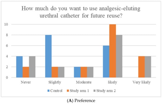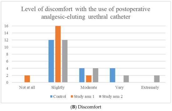 All 60 patients satisfied the study criteria and were included in the final analysis. The subjects’ mean age was 57.4 years old, without significant differences observed among the groups. Insignificant differences were found among the groups regarding the ASA score, the body mass index, the underlying diseases, the type of urologic surgery conducted, the duration of postoperative catheterization, or length of hospital stay (Table 1). When analyzing the pre- and postoperative IPSS and OABSS questionnaire scores, no significant differences were observed among the groups (Table 2). The intention to reuse the catheter in the future was higher in the analgesic-eluting group (both study 1 and 2 groups), which did not reveal statistical significance (p = 0.658). Additionally, most subjects, regardless of group, reported slight discomfort with the catheter, without significant differences among the groups (p = 0.558). Only two patients in study arm 1 reported no discomfort with the catheter (Figure 2).
