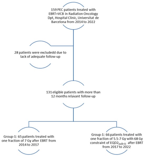 The present study was approved by the Institutional Ethical Review Board of our center (HCB 2022/0379), and patient consent for study participation was obtained. We retrospectively analyzed 159 post-operative endometrial cancer (PEC) patients treated with EBRT followed by VCB from 2014 to 2022. Among these 159 patients, 28 (14 patients from each group) were excluded due to a lack of at least 12 months of follow-up or related assessments, and thus a total of 131 patients were analyzed.