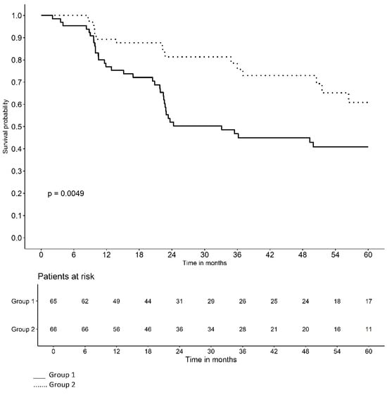 Table 4 shows the results of the multivariable analysis of prognostic factors of time to the appearance of the LVCs. This analysis revealed that VD use of <9 months was associated with a HR of 3.07 (95% CI 1.30, 7.23; p = 0.010), indicating a significant three times higher risk of developing LVCs compared to VD use ≥ 9 months. Furthermore, the multivariate model identified group assignment as an independent prognostic factor, with Group-1 demonstrating a HR of 1.99 (95% CI 1.11, 3.55; p = 0.021) compared to Group-2.