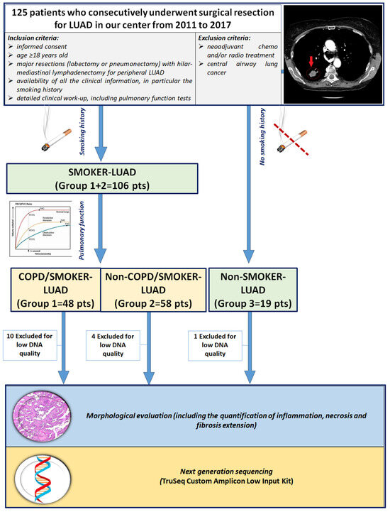 This retrospective observational study included 125 white patients who consecutively underwent surgical resection for LUAD in our center from 2011 to 2017. A subset of the study population was included in a previous study by our group [29]. Inclusion criteria were (1) age > 18 years old; (2) major resections (lobectomy or pneumonectomy) with hilar-mediastinal lymphadenectomy for peripheral LUAD; (3) no chemo and/or radio neoadjuvant treatment; (4) availability of informed consent; (5) detailed work-up, with complete physical examination, chest radiography, computed tomography scan of the chest, abdomen and brain, bone scan, electrocardiography, routine blood tests and complete pulmonary function tests (PFTs) (including vital capacity—VC; forced expiratory volume in 1 s-FEV1; mid expiratory forced expiratory flow—FEF25–75; forced vital capacity—FVC; total lung capacity—TLC; residual volume—RV; expiratory reserve volume—ERV; and transfer coefficient for carbon monoxide). Patients with extended LUAD, previously chemo and/or radio treated and with central airway lung cancer were excluded in order to avoid distortions of lung architecture or the presence of local and/or systemic inflammatory reactions secondary to oncologic treatment, as previously described [29] (Figure 1). The smoking status of the patients was distinguished as non-smokers (in absence of any history of smoking) and smokers (if the patient was a former or current smoker, of any entity). Patients enrolled in the study were divided into 3 groups according to smoking history and PFTs: COPD/smoker LUAD patients (Group 1: 48 cases), non-COPD/smoker LUAD patients (Group 2: 58 cases) and non-COPD/non-smoker LUAD patients (Group 3: 19 cases). DNA quality was adequate in 110 patients, thus the study focused on those cases. Clinical, anamnestical and morphological data at the time of surgery were recorded in an electronic database. The study was designed in accordance with the Helsinki declaration. Patients gave informed consent for research purposes prior to the surgical procedure.