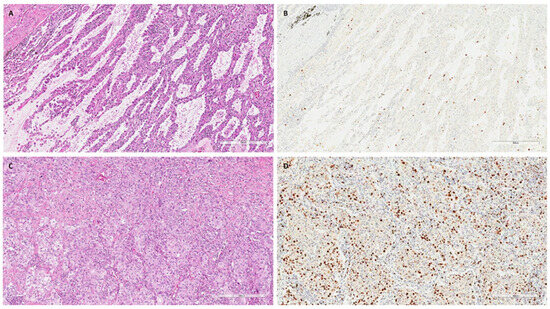 Explanatory images of a non-COPD/non-smoker LUAD and a non-COPD/smoker LUAD. Explanatory images showing a non-COPD/non-smoker LUAD with a lepidic pattern ((A), hematoxylin and eosin, scale bar: 300 µm) and a low proliferative index ((B), Ki67 immunostaining, scale bar: 300 µm). In contrast, a LUAD with solid pattern ((C), hematoxylin and eosin, scale bar: 300 µm) with a high proliferative index ((D), Ki67 immunostaining, scale bar: 300 µm) was detected in a non-COPD/smoker patient.