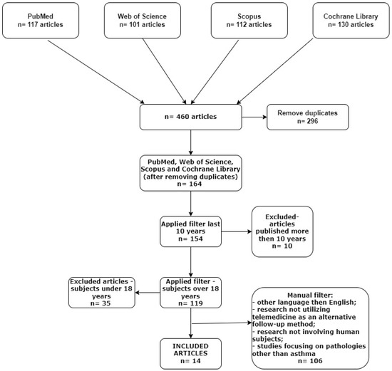 The selection of articles for this literature review adhered to the guidelines of PRISMA (Preferred Reporting Items for Systematic Reviews and Meta-Analyses). The literature search was carried out in May 2024 utilizing the PubMed database, Web of Science, Scopus, and Cochrane Library, with a focus on studies published from 2014 to 2024, encompassing a span of 10 years. We utilized the following MeSH terms for the PubMed search: ((“telemedicine” [MeSH Terms]) AND (“severe asthma” [MeSH Terms])) AND ((“asthma” [MeSH Terms]) AND (“home spirometry” [MeSH Terms])), (tele-pulmonary rehabilitation [MeSH Terms]) AND (asthma [MeSH Terms]). The search on Web of Science was conducted using the topic option that focuses on analysis. Queries are conducted on the title, abstract, keywords plus, and author keyword fields, utilizing the specified keywords as follows: “asthma control”, “home monitoring systems”, “home spirometry”, ”tele-pulmonary rehabilitation”, “portable spirometers”, and “asthma telemedicine”. The same protocol was used for Scopus and Cochrane Library searches. The search was restricted to journal articles written in English. A methodical and systematic search strategy was employed to identify pertinent scientific papers that investigate the utilization and efficacy of telemedicine in patients with asthma, according to the PRISMA statement and checklist [23].