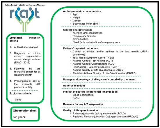 The Italian Registry of Allergy Immunotherapy (RIAIT) is a multicenter observational study that aims to collect the most extensive data available on Italian patients using AIT for respiratory allergies (rhinoconjunctivitis and/or asthma) in a real-life context, through a network of allergy reference centers with specific interest and expertise in the management of allergic respiratory patients.