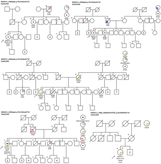 Another recurrent mutation was RAD51C c.394dupA; p.(Thr132Asnfs*23). The variant was identified in four patients: two with unilateral BC, one with ovarian cancer, and another with both bilateral breast and ovarian cancer (Table 2). This proband (004), with double primary cancers and no family history of breast or ovarian cancer, was seen in her family, but only lung and pancreas cancers in one of her sisters and her father. Family histories of breast or ovarian cancers were seen in the other three probands (Figure 1).