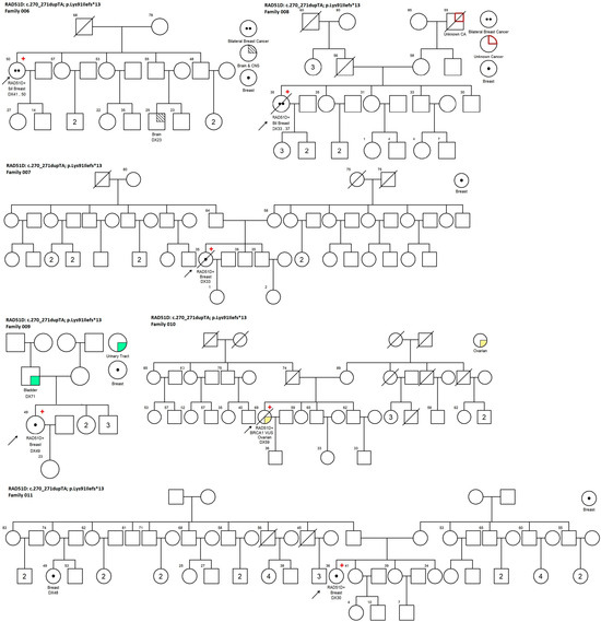 Studying the family pedigrees from these c.270_271dupTA; p.(Lys91Ilefs*13) carriers (Figure 1), Family 014 showed phenotype segregation with her mother with BC. Four out of eleven families had family histories of breast or ovarian cancer in their first- to third-degree relatives. A study found that in RAD51D carriers with two first-degree relatives affected with BC, lifetime risks increased to 40% [14] while the risk was 20% [21] for those with no significant cancer family history. One case was reported to carry two deleterious mutations in cis (G217X and Q219X) in RAD51D genes. She had no family history of breast and ovarian cancer in her first-degree relatives but had personal ovarian cancer at a late age [16].