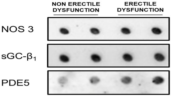 Representative dot-blots showing the expression of nitric oxide synthae3 (NOS3), the β1 subunit of soluble guanylate cyclase (sGC-β1), and phosphodiesterase 5 (PDE5) in buccal mucosa samples obtained from patients with functional and dysfunctional erection one year after radical prostatectomy.
