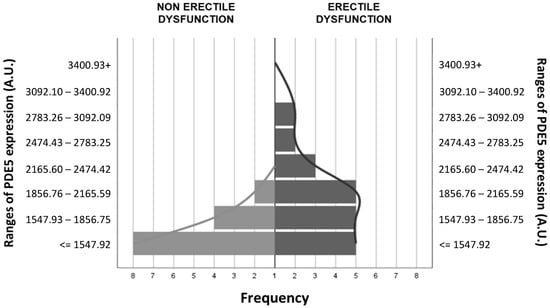 Histogram showing the frequency of phosphodiesterase 5 expression ranges in buccal mucosa samples obtained from patients with functional and dysfunctional erection one year after radical prostatectomy. Abbreviations. PDE5: phosphodiesterase 5; A.U: densitometric Arbitrary Units.