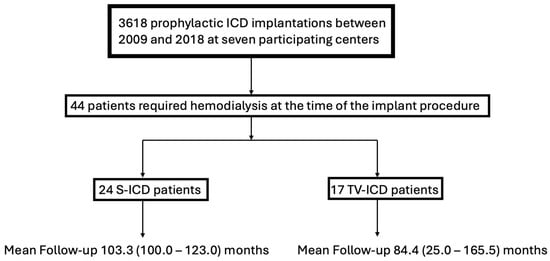 This study is a retrospective analysis of patients who received either an intermuscularly placed S-ICD or TV-ICD, who did not require pacing or ATP and suffered from concomitant ESRD requiring HD. Patients were recruited from seven experienced centers (>100 ICD implantations per year and center) in Germany (University Hospital Bergmannsheil Bochum, Marienhospital Gelsenkirchen, University Hospital Katholische Kliniken St. Josef Bochum, University Hospital Duesseldorf, Marien-Hospital Luenen, Augusta Hospital Bochum and Elisabeth Hospital Recklinghausen) with the same standard approach for device implantation. The devices were implanted between 2009 and 2018. Informed consent was obtained. The study protocol conforms to the ethical guidelines of the 1964 Declaration of Helsinki and its later amendments. It was approved by the ethics committee of the Ruhr University Bochum (Register 22-7593-BR). All participating patients had indications for an ICD following the guidelines and a good quality life-expectancy > 1 year, despite ESRD requiring HD [1,2]. Medical history was obtained from the hospital records.