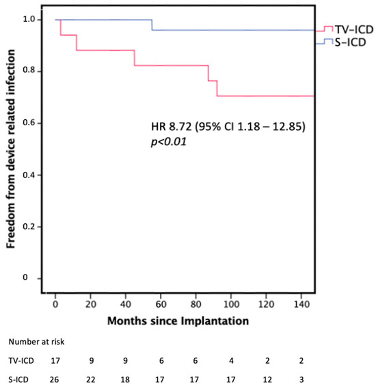 Kaplan–Meier graph illustrating the freedom from device-associated infections requiring device removal. TV-ICD = Transvenous ICD; S-ICD = Subcutaneous ICD.