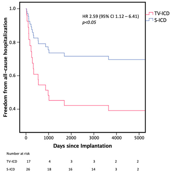 Kaplan–Meier graph illustrating the freedom from all-cause hospitalization. TV-ICD = Transvenous ICD; S-ICD = Subcutaneous ICD.