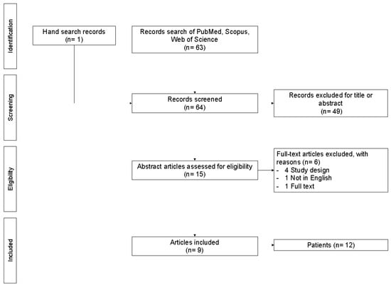 The comprehensive search of key databases yielded 63 non-duplicate records. One additional eligible record was identified via hand search. We excluded 49 records according to the title or abstract. Four records were excluded for the study design, one was excluded because it was not relevant, and one record was excluded due to the language used. Finally, we identified nine eligible records for the full-text review (Figure 1).