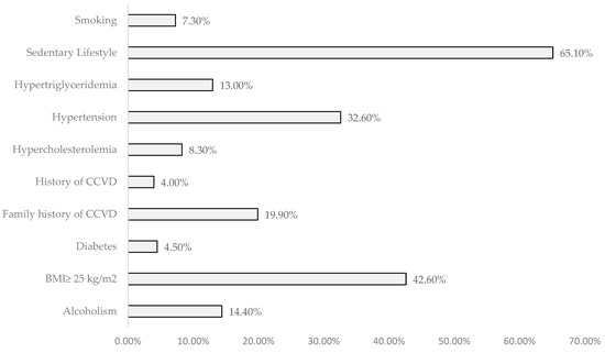 From the study of risk factors analyzed, it is observed, according to Figure 1, that sedentary behavior, BMI ≥ 25 kg/m2, and hypertension had the highest prevalence rates.