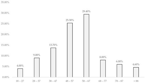 According to the number of individuals in each age group, the highest prevalence of electrocardiographic changes was found in the age group above 88 years (50%), followed by 78–87 years (35%), showing a statistically significant relationship (p < 0.001), as analyzed in Figure 2.