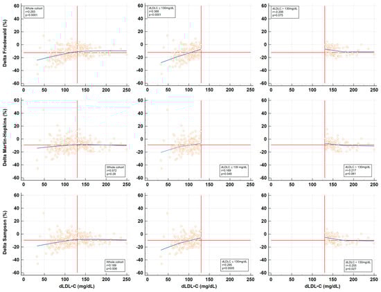 Correlations between %Delta values (the difference between estimated and measured LDL-C) and dLDL-C for each of the three equations studied. Initially, correlations were assessed for the entire cohort (n = 210). Due to the observed biphasic trend in the data, as indicated by the blue LOESS trend lines (smoothing span: 99%), the analysis was stratified by dLDL-C levels, dividing the dataset at the vertical red line into two subdomains: ≤130 mg/dL (n = 135) and >130 mg/dL (n = 75). The horizontal red line represents the mean %Delta value for each equation.