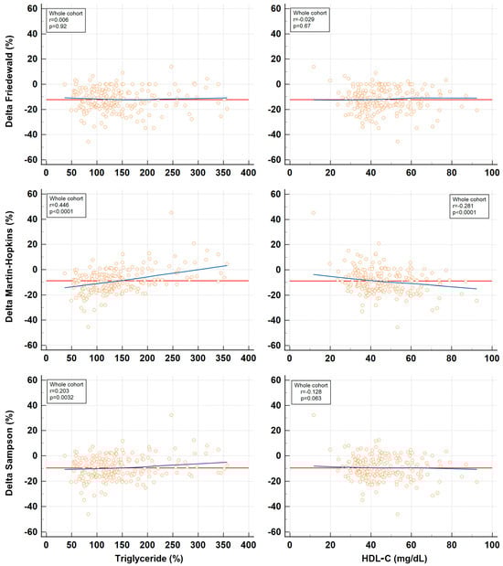 Correlations between %Delta values (the difference between estimated and directly measured LDL-C) and triglycerides or HDL-C for each of the three equations evaluated. The analysis is based on a cohort of 210 individuals. The data trends are illustrated by the blue LOESS trend lines (smoothing span: 99%). The horizontal red line indicates the mean %Delta value for each equation.