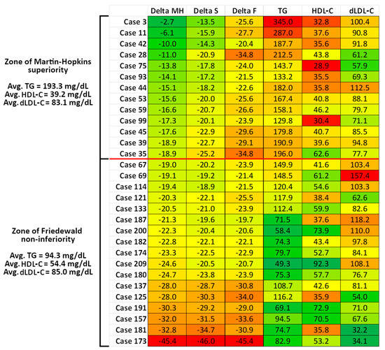 This heat map displays a cohort subgroup of 30 individuals, selected due to at least one extreme %Delta value (the difference between estimated and directly measured LDL-C: either below −20% or above 20%). The columns are indexed based on the %Delta Martin–Hopkins value, which is presented in the first column from least to most biased. %Delta values: green indicates low bias, while red signifies high bias. Triglycerides (TGs) and directly measured LDL-C (dLDL-C): green represents low concentrations and red indicates high concentrations. HDL-C: green denotes high concentrations and red denotes low concentrations. A horizontal red line divides the map into two regions. Upper region: The Martin–Hopkins equation is superior, with %Delta values being at least 5% less biased compared to the Friedewald equation. Lower region: The Friedewald equation is non-inferior, with less than a 5% difference in %Delta values. This heat map facilitates pattern recognition according to the hypothesis outlined in Table 3: the Martin–Hopkins equation tends to be highly inaccurate when LDL-C is low, triglycerides are low, and HDL-C is high. For detailed statistical analysis supporting these patterns, refer to Table 4.