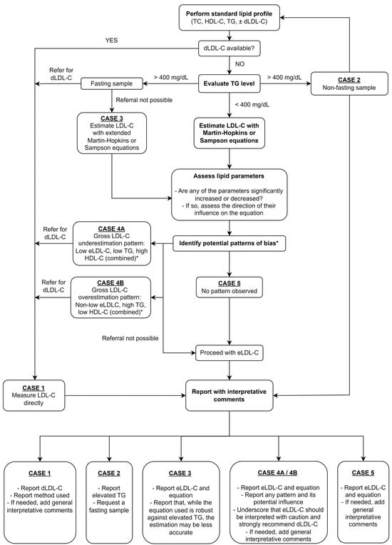 Proposed algorithm for personalized lipid management. * Note: Gross under/overestimation does not always require all three factors (significant skew in one or two factors can also lead to bias, especially if not counterbalanced by the other parameters). Case 3 can be combined with cases 4A, 4B, or 5. Abbreviations: (d/e)LDL-C—(directly measured/estimated) low-density lipoprotein cholesterol, HDL-C—high-density lipoprotein cholesterol, TC—total cholesterol, TGs—triglycerides.
