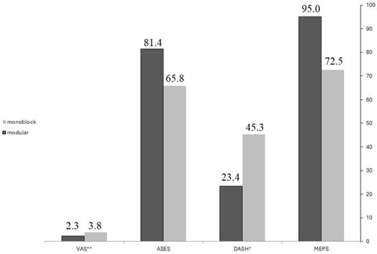 Patients in the modular group demonstrated superior functional outcomes compared to the monobloc group, with statistically significant better results in MEPS (