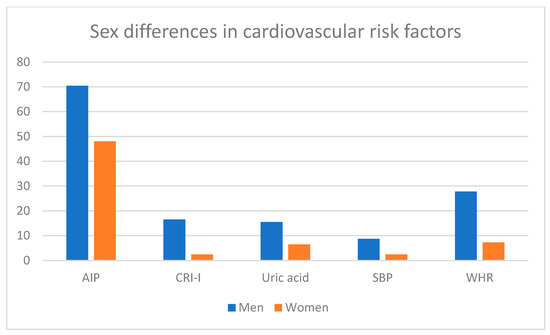 The main sex differences in cardiovascular risk factors and urinary abnormalities are shown in Figure 1; Figure 2, where we can observe that men had a higher frequency of the main cardiovascular risk parameters (CRI-I, AIP, uric acid, SBP and WHR) than women (Table 1), while women showed a higher frequency of urinary abnormalities than men (Table 2).