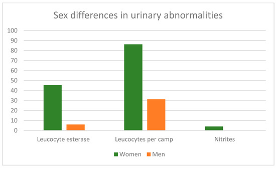 Finally, the abnormalities observed in the urine test (leukocyte esterase, leukocytes, nitrites, and erythrocytes) were clearly more frequent in women than in men. In the case of erythrocytes, this difference can be explained by the presence of menstruation and additionally by the presence of urinary tract infections, which have been reported with higher frequency in women than in men [36], and which are also related to the presence of leukocytes and leukocyte esterase [5]. These variables have shown high positive predictive values for detecting urinary tract infections in patients with type 2 diabetes [5]. Based on these parameters, around half of the included women would present a urinary tract infection.