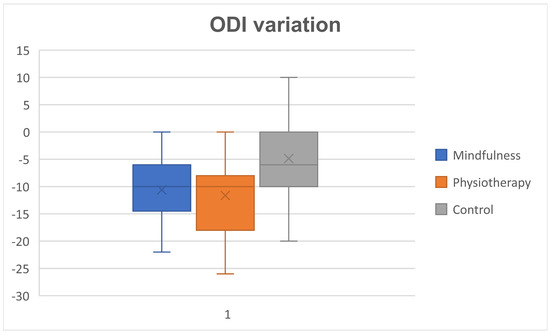 Patients undergoing mindfulness or physiotherapy showed a significant improvement in terms of ODI, with mean variations of 10.6 points for mindfulness and 11.6 points for physiotherapy, while the mean variation was 4.9 points for the control group. For each single patient, the variation in terms of ODI was measured as the difference between the two time points, postoperative post-treatment at 6 months and right after surgery (Figure 1).