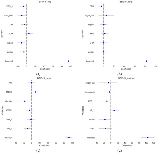 Forest plots of the linear regression results. The estimates or coefficients per model are shown on the x-axis, while the variables are presented on the y-axis in each subplot. The blue dot is the estimate, and the grey line is the confidence interval. The presented variables are those that have passed the variable selection procedure on the train set for (a) the BSID III cognitive outcome; (b) the BSID III language outcome; (c) the BSID III motoric scores and (d). BSID III socio-emotional assessment.