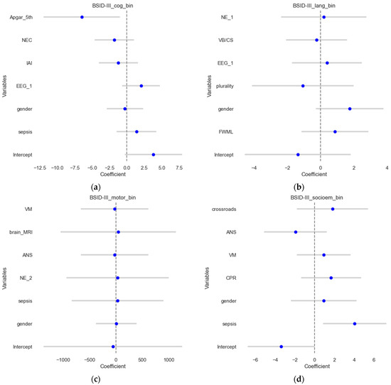 Forest plots of the logistic regression results. The estimates or coefficients per model are shown on the x-axis, while the variables are presented on the y-axis in each subplot. The blue dot is the estimate, and the grey line is the confidence interval. The results presented show logistic regression coefficients for (a) the BSID III cognitive outcome; (b) the BSID III language outcome; (c) the BSID III motoric scores and (d). BSID III socio-emotional assessment.