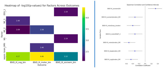 Besides testing multivariate models, we also tested univariate associations for the four outcomes. Fisher’s exact test was used to determine potential associations between two categorical variables (to the outcomes), while Spearman’s correlation was used for continuous variables. The correlation results in Figure 4 (right side) indicate a significant association between the duration of mechanical ventilation (MV) and cognitive, motor, and socio-emotional outcomes. Notably, children who experienced shorter MV achieved better Bayley scores. Additionally, gestational age emerged as another statistically significant factor for socio-emotional outcomes. Longer gestation demonstrated significantly higher Bayley-III scores in the socio-emotional domain than those born earlier. Neurological examination at term and 12 months of CA and sepsis displayed significant associations with cognitive outcome. Sepsis, neurological examination at 12 months of CA, and abnormal MRI findings at TEA displayed significant associations with motoric outcome. Sepsis also had a significant association with socioemotional outcomes, as well as neonatal seizures and EEG at TEA. The presence of sepsis is likely to impact cognitive, motor, and socio-emotional outcomes in the studied population.