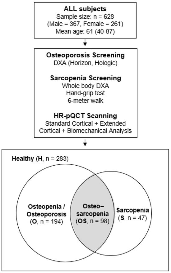 This is a retrospective, cross-sectional study which included 628 community-dwelling Chinese adults in Hong Kong, aged 40 and above, who received bone and muscle assessments at the Prince of Wales Hospital. Subject data were extracted from a published database and the clinical approach to data collection has been described in our previous publication [13]. In brief, subjects were able to walk independently, had no history of fragility fractures, and had not received osteoporosis treatment recently. Those with conditions or medications that could affect bone and muscle metabolism were excluded to control for confounding variables. Subjects were assessed by DXA to determine their bone mineral density defined by WHO and screened for sarcopenia based on the Asian Working Group for Sarcopenia definition in 2019 (AWGS 2019) [14]. Additional HR-pQCT data were also available to examine microarchitecture and biomechanical parameters for further analysis on bone quality (Figure 1). All procedures and assessments were conducted in the Prince of Wales Hospital (Bone Quality and Health Centre, Department of Orthopaedics and Traumatology, The Chinese University of Hong Kong). Ethics were approved by the Joint Chinese University of Hong Kong–New Territories East Cluster Clinical Research Ethics Committee (CRE.2014.310). All participants provided written informed consent, and all research were performed in accordance with relevant guidelines and regulations and the Declaration of Helsinki. Subjects were divided into 4 groups for analysis based on their status, namely Healthy (H, for those without any of the disease states in question), Osteopenia/Osteoporosis only (O, for those with low BMD with T-score < −1), Sarcopenia only (S), and Osteosarcopenia (OS) groups. Subjects eligible for both osteopenia/osteoporosis and sarcopenia groups were only included in the OS group for analysis.