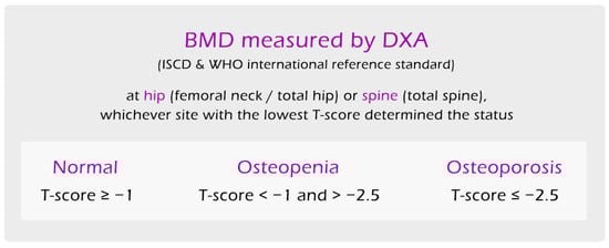 Diagnostic criteria for low bone mineral density (osteopenia/osteoporosis) used in this study.