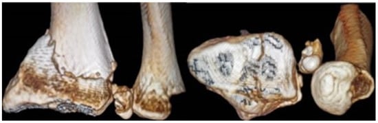Ulnar styloid fractures, often associated with distal radius fractures (DRFs), impact forearm rotation and stability [46]. These fractures are classified as tip and base fractures, aiding in their management [47,48]. The necessity of surgical fixation remains debated, with studies showing mixed results in terms of outcomes (Figure 5) [43,49,50]. Early detection and treatment are crucial, with nonunion repair or fragment excision sometimes being necessary [51,52].