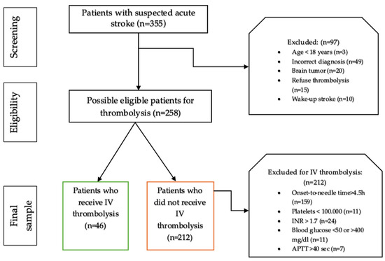 We included in this study all consecutive patients who addressed the emergency department with symptoms of acute stroke, were identified as patients with suspected acute stroke by the triage nurse, and had complete medical records, both in electronic and paper format. Out of the initial sample of 355 patients, only 258 met the eligibility criteria for our study after careful screening. According to our national protocol, initiating intravenous thrombolysis with rt-PA is recommended within 4.5 h of the onset of stroke symptoms (“onset-to-needle time”) [8]. Therefore, patients who did not meet the eligibility criteria for intravenous thrombolysis were excluded. This involved patients under the age of 18, those diagnosed with intracerebral hemorrhage or brain tumor at the brain and neck computer tomography, and individuals who arrived at the emergency department more than 4.5 h after experiencing stroke symptoms. Both physicians the emergency medicine physician and the on-duty neurologist, decided these exclusions based on the patient’s medical history, laboratory, and head and neck CT scan results. Of the 258 remaining in the final sample, only 46 benefited from treatment with intravenous Alteplase (see Figure 1). Informed consent was obtained from all patients involved in the study.