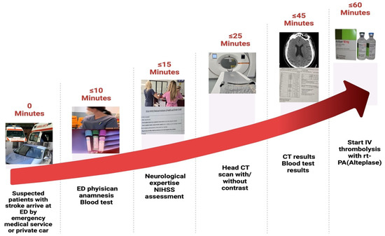 Our national protocol [8] suggests the following ED time targets for managing AIS: onset-to-needle time should be ≤4.5 h; door-to-physician time should be ≤10 min (which includes an initial assessment by both the emergency medicine physician and neurologist, covering the last known well time, IV thrombolysis eligibility, and stroke severity evaluation); door-to-CT time should be ≤25 min; door-to-CT results should be ≤45 min; and door-to-needle time should be ≤60 min, as indicated in Figure 2.