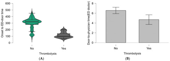 Graphical representation of the values of ED time targets (minutes) and the two groups: (A) The rainclouds for the onset-to-ED-door time (p < 0.001). (B) The boxplots for the door-to-physician time (ED doctor) (p = 0.009). Within the violin boxplots are the median and interquartile ranges.