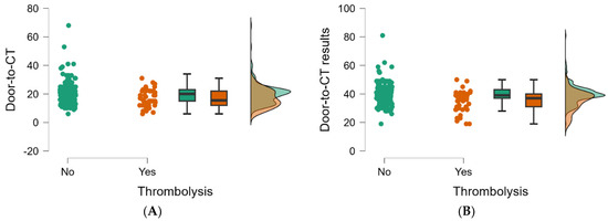 Raincloud plots of the values of ED time targets (minutes) between the two groups of patients: (A) The door-to-CT time (p = 0.009). (B) The door-to-CT results time (p < 0.001).