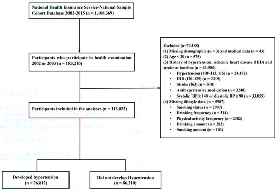 Out of 1,108,369 participants in the NHIS-NSC 2.0, 183,210 who underwent at least one general health examination between 2002 and 2003 were selected. Participants with missing demographic or medical information (n = 46); under the age of 20 years (n = 575); and with pre-existing hypertension (n = 24,452), ischemic heart disease (n = 2315), and stroke (n = 518) were excluded. Furthermore, participants with a history of antihypertensive medication use (n = 3240), those with systolic blood pressure ≥ 140 mmHg or diastolic blood pressure ≥ 90 mmHg (n = 33,055) [20], and those with missing data on lifestyle variables of interest (n = 5987) at baseline were excluded, leaving 113,022 participants (65,315 men) for analysis (Figure 1).