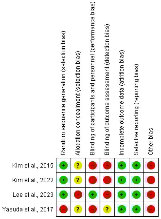 The Cochrane Risk of Bias Tool [42] was employed to categorize the risk of bias levels of studies included in the meta-analysis into three categories as follows: low, high, or unclear in the following areas: random sequence generation, allocation concealment, blinding of participants and personnel, blinding in outcome assessment, integrity of outcome data, selective reporting, and other potential sources of bias. Studies without a high risk of bias in any category were classified as high quality (1++), those with a high risk or two unclear risks as medium quality (1+), and others as low quality (1−). For the risk of bias assessment, the Cochrane Handbook for Systematic Reviews of Interventions [43] (RevMan® Version 5.4) was used to evaluate articles, assigning ratings, performances, detections, attrition biases, and other potential biases. Statistical analysis and bias assessment were conducted using Review Manager software version 5.4® (Cochrane Library, London, UK). Additionally, data were imported into the GradePro® application (https://www.gradepro.org/, accessed on 8 July 2024) to evaluate the degree of recommendation into four levels (⨁◯◯◯ = Very Low; ⨁⨁◯◯ = Low; ⨁⨁⨁◯ = Moderate; ⨁⨁⨁⨁ = High) [44]. A sensitivity analysis was performed to evaluate the robustness of the results by sequentially excluding each study. p-values less than 0.05 were considered statistically significant.