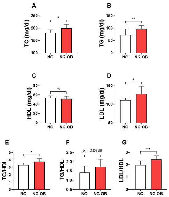 A comparative analysis of the lipid parameters between the non-obese (NO) group and normoglycemic obese (NG-OB) subjects. Changes in the levels of lipid markers between the NO and NG-OB groups are presented for TC (A), TGs (B), HDL (C), LDL (D), TC/HDL (E), TGs/HDL (F), and LDL/HDL (G). ns indicates not significant, while * (p < 0.05) and ** (p < 0.01) indicate significance.