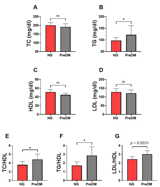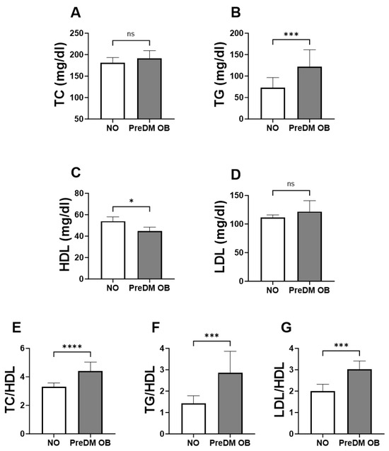 Assessing the lipid abnormalities between the normoglycemic obese (NG-OB) and prediabetic obese (PreDM-OB) groups. The changes in the levels of lipid markers between the NO and NG-OB groups are demonstrated for TC (A), TGs (B), HDL (C), LDL (D), TC/HDL (E), TGs/HDL (F), and LDL/HDL (G). ns indicates not significant while * (p < 0.05) indicates significance.