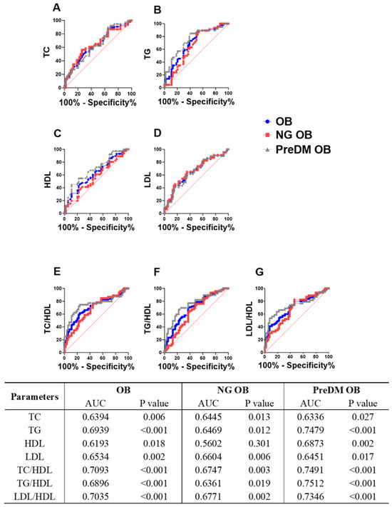 ROC curve analysis of lipid parameters for different obesity phenotypes. ROC curves of lipid parameters in obese (OB), normoglycemic obese (NG-OB), and prediabetic obese (PreDM-OB) groups are illustrated for TC (A), TGs (B), HDL (C), LDL (D), TC/HDL (E), TGs/HDL (F), and LDL/HDL (G). Area under the ROC curve (AUC) and p value of each lipid parameter is shown in table.