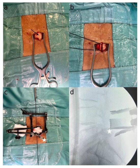 (a) Exposure of the skin incision and the muscular fascia (black arrow); (b) handling of the muscle fascia; (c) skeletonization of the homolateral lamina and positioning of a Caspar distractor. Klemmer forceps (white star) placed beneath the lamina for X-ray verification; (d) X-ray confirmation of the Caspar distractor’s accurate placement at the correct level.