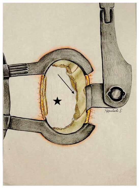 A Kerrison rongeur or a high-speed drill with a diamond-tipped burr is used to carefully remove a portion of the lamina within the trapezoid, stopping at the medial borders of the superior and inferior articular processes, which remain intact. Full visualization of the yellow ligament, now separated from the lamina, is achieved. The ligament is then gently lifted and detached by positioning the Kerrison forceps under the lower portion of the lamina. The forceps are moved in a supero-caudal direction, then rotated infero-caudally to carefully release the ligament from the base of the spinous process. Finally, using Weil forceps, the ligament is carefully removed laterally towards the articular process, allowing direct visualization of the epidural fat and enabling homolateral decompression of the spinal cord (Figure 4).
